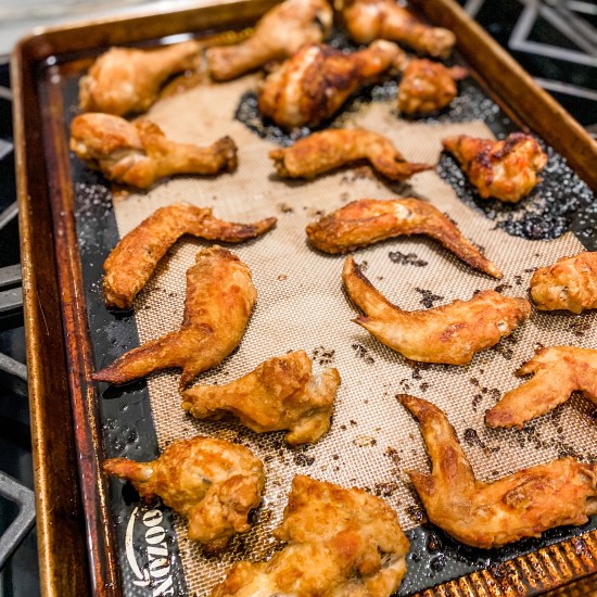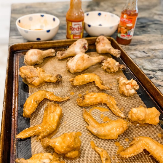 While I’m not a huge fan of frying food (mostly because of how it makes me feel and the health factor), wings can be an exception now and again. With it being the football finals tonight and the Buffalo Bills are trying to earn their spot in the Super Bowl, I am making my beloved Buffalo wings (fingers crossed, Bills!). They are made using a combination fry, then bake approach. So I like to think of them as half healthy, half not so much. 🙂