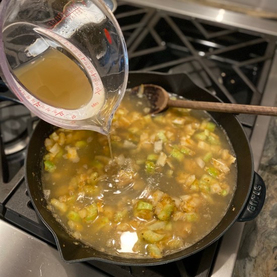 - Add onions, celery, thyme and garlic and cook until slightly softened. Stir in the broth a bit at a time until smooth.