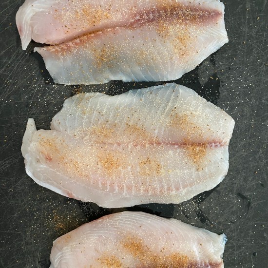 - Sprinkle fish with garlic powder and Old Bay. Place flour in a shallow bowl. Lightly beat egg in a second shallow bowl. Add breadcrumbs to a third shallow bowl. Dredge each piece of fish in the flour, then dip in the egg, letting the excess drip off, then dredge in the breadcrumbs, shaking off any excess. Set on a clean plate.