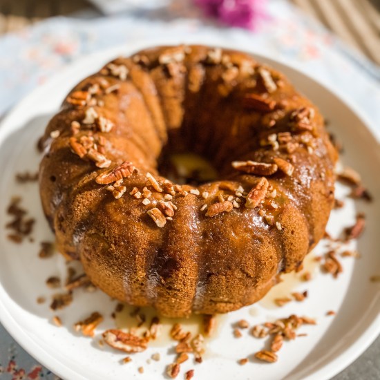 - Remove the cake from the pan, onto a serving plate. Spoon the glaze over the warm cake (you could also top with some toasted walnuts or pecans, like I did here!). Cool for a little longer before serving. Enjoy!