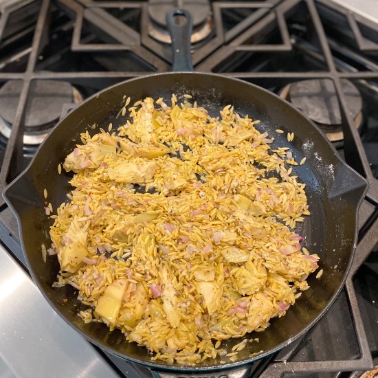 - To the skillet, add 2 tablespoons olive oil and the artichokes. Cook undisturbed for 2 minutes or until golden. Add 2 tablespoons butter, the shallots, garlic, thyme, and a pinch each of salt, pepper, and red pepper flakes. Cook 2-3 minutes, until fragrant. Add the orzo. Cook another 2 minutes.