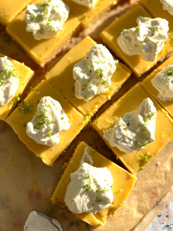 - Before serving, using an electric mixer to whip the cream until soft peaks form. Add the honey and 1 teaspoon vanilla. Whip to combine. Swirl the cream onto the bars. In a bowl, mix the lime zest and a pinch of flaky salt. Sprinkle over the bars. Slice and enjoy!