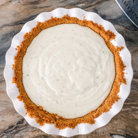 - To make the topping: in the bowl of an electric mixer, beat the heavy cream until soft peaks form. Add the confectioners’ sugar and beat until medium peaks form. Top the pie with the whipped cream. Decorate with the lime zest and lime slices. Enjoy!