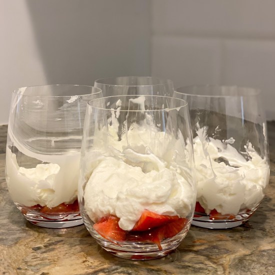 - Using any kind of clear glass (like a wine glass) or a tall, skinny ice cream bowl, add some strawberry pieces to the bottom and top with a large scoop of yogurt. Then, layer with blueberries, then more yogurt, then repeat until filled. Refrigerate until ready to serve! Enjoy!