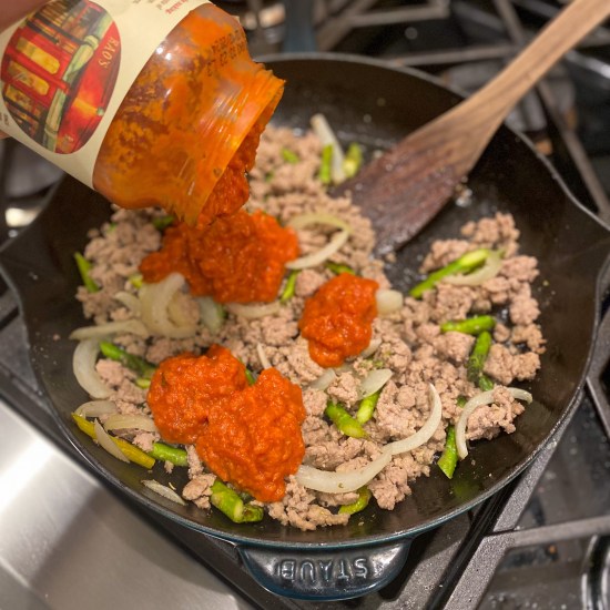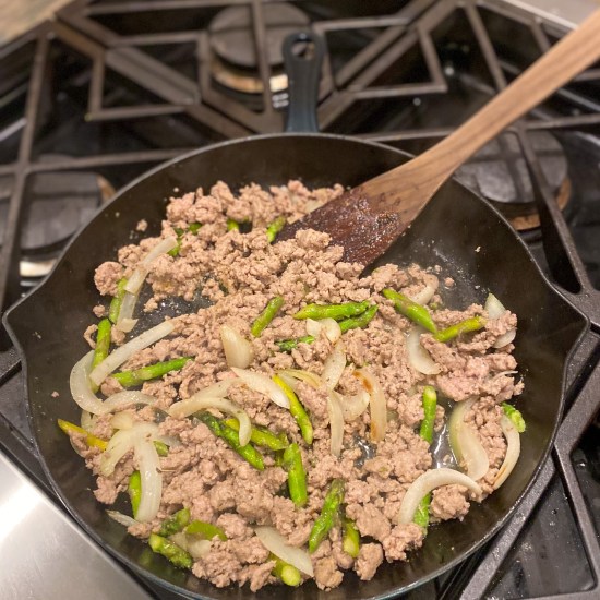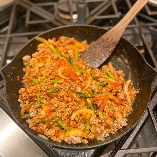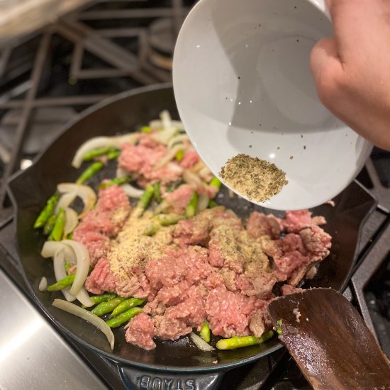 - Add in the spices and continue cooking until the meat and veggies are fully cooked through.