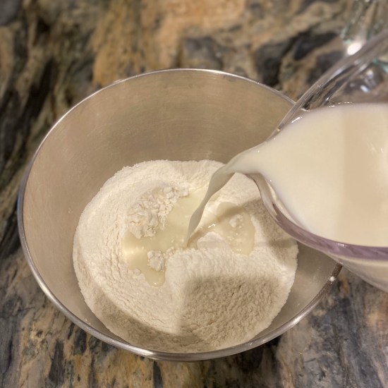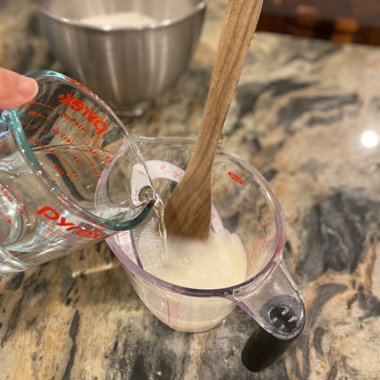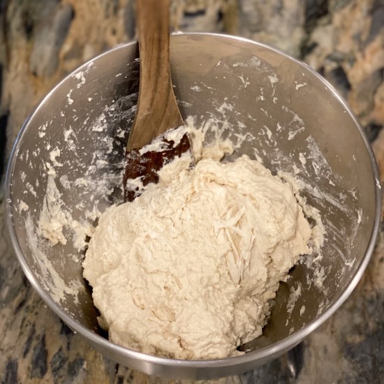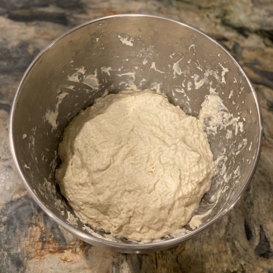 - 8pm: Make the dough – To a medium bowl, add the flour, then add the salt. Mix the starter and water together in a separate small bowl until cloudy and well mixed. Pour the starter-water into flour and mix until flour is fully incorporated. The dough should be thick, shaggy, and heavy. Mix for about 1-2 minutes then cover with a wet kitchen towel to rest for 15 minutes.