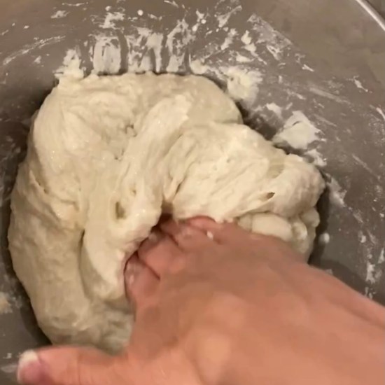 - 8:20: Stretch dough – With wet hands, pull the dough from one side of the bowl and stretch it upward. Then fold it up and over to the center of the dough. Quarter turn the bowl and repeat, stretching up and folding it over the middle, repeat for about 30 seconds or until the dough gets firm and resists. This helps strengthen the gluten. Cover, rest, and repeat the process 15 minutes later.