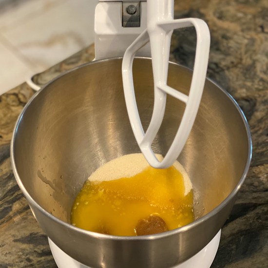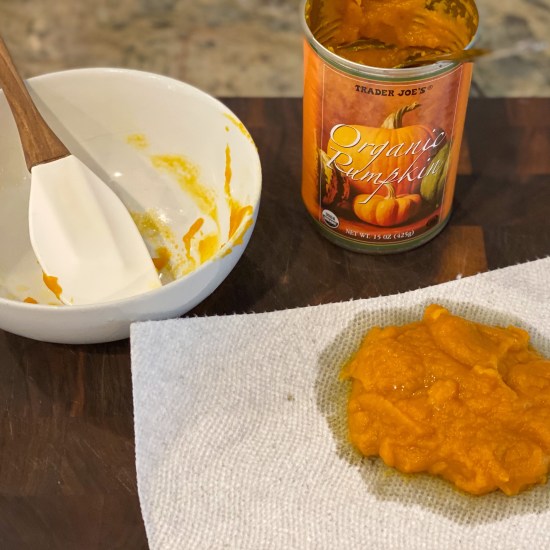 - Whisk the melted butter, brown sugar, and granulated sugar together in a medium bowl until no brown sugar lumps remain. Whisk in the vanilla and blotted pumpkin (*see note below) until smooth. Set aside.
