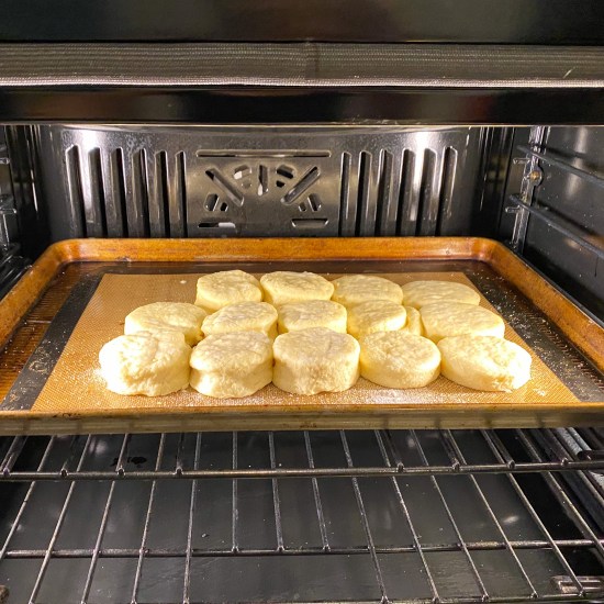 - Arrange in a 10-inch cast iron skillet or close together on a parchment paper or silicone baking mat lined baking sheet. Make sure the biscuits are touching.