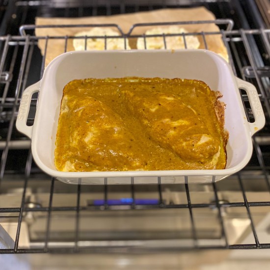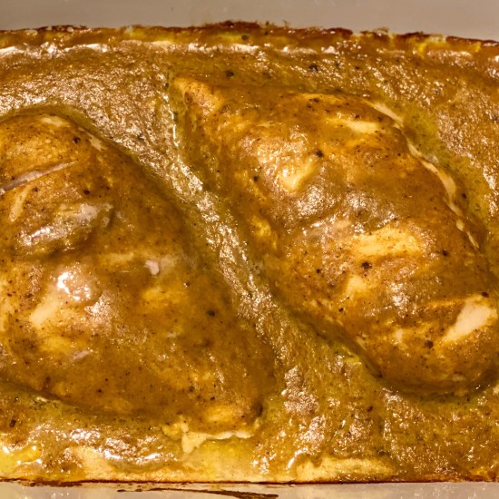 Make a few deep cuts in each chicken breast and put the breasts in a roasting pan. Pour the curry sauce over the chicken, making sure the sauce gets into the cuts. Roast in the bottom third of the oven until the chicken is just done, about 20 minutes.