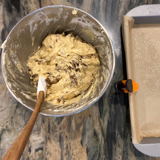 - Spread mixture in pan and sprinkle with remaining chocolate chips. Bake for 20-35 minutes, until just baked.