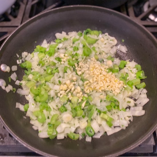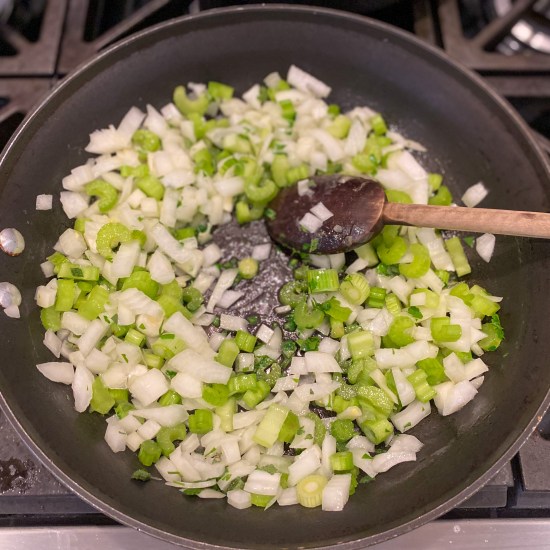 - In a large skillet, add the butter and melt over medium heat. Add the celery, onions, thyme, sage, scallions, a pinch of salt and a few grinds of pepper. Cook until the onions and celery are tender, 8 to 10 minutes. Add the garlic and cook for another 30 seconds to a minute. Transfer the vegetables to a large mixing bowl.