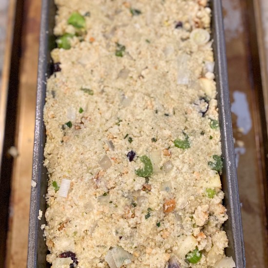 Stuffing – in my world, it’s not a family fav. But it’s such a staple at Thanksgiving and Christmas time, that we had to find a way to make it delicious. It’s usually pretty mushy and can even be bland, so when I found this flavor-packed, fruit and veggie stuffing all made into a tight bread, I knew it would be a winner.