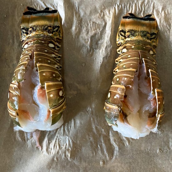 - Using kitchen shears, butterfly the tail by cutting down the center of the back of the lobster. Loosen the meat and pull the lobster meat upward. Salt and pepper the meat and set on a baking sheet.