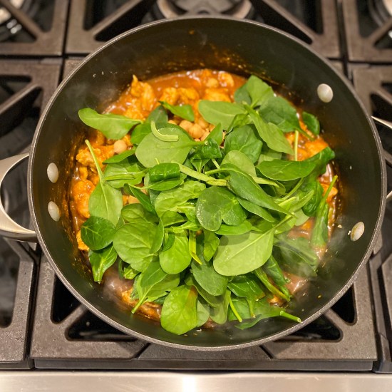 To make this amazingly easy Chicken, Chickpea & Spinach Curry, I used TJ’s Malabar Style Curry Sauce. There’s a reason this sauce has a cult following. It’s the perfect mix of sweet, savory and spice. It really works well with the chicken and I imagine it would be just as good with tofu or a white fish. I found the addition of the fresh herbs and cucumbers to really compliment the sauce, too!