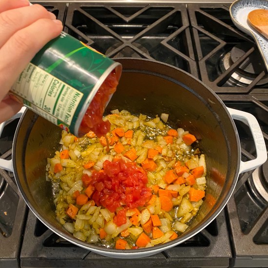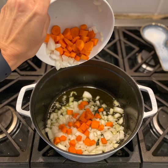 - Warm the olive oil in a large pot over medium heat. Once the oil is shimmering, add the onion & carrot and cook, stirring often, until the onion has softened and is turning translucent, about 5 minutes.