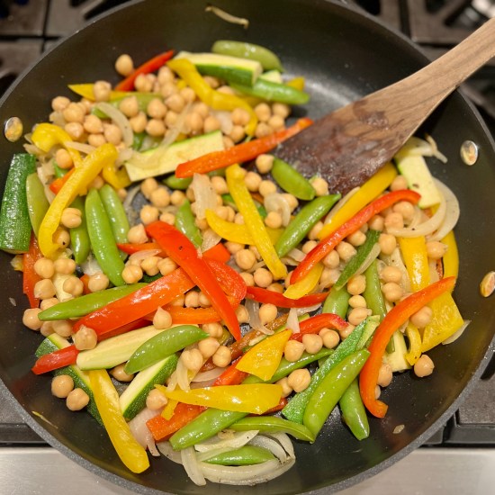 2. While pasta is cooking, heat oil in an extra-large skillet over medium-high heat. Add onion; cook until softened, 2 to 3 minutes. Add peppers, zucchini and pea pods and cook until just tender, about 5 minutes. Add chickpeas and toss. Season with salt and pepper.