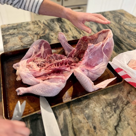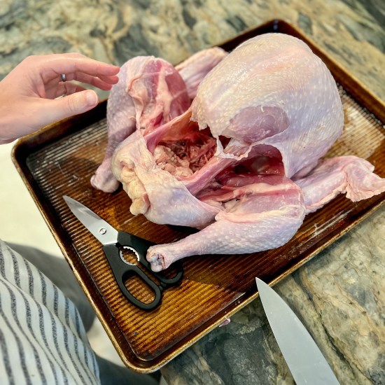 - Using poultry shears or kitchen scissors, cut along the bottom side of the breast from the bottom cavity to the wing joint (you are not cutting all the way through the side of the turkey). Repeat on the other side.