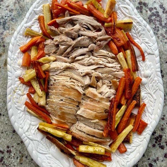 So, here’s what we did – the Friday before Thanksgiving, we took our 26 pound turkey out of the freezer and defrosted it in the fridge until Monday. On Monday, we pulled it out, spatchcocked it and brined it. We refrigerated it for 3 days with the dry brine and then Thursday, we roasted and ate it! It’s a super great process and super delicious to eat.