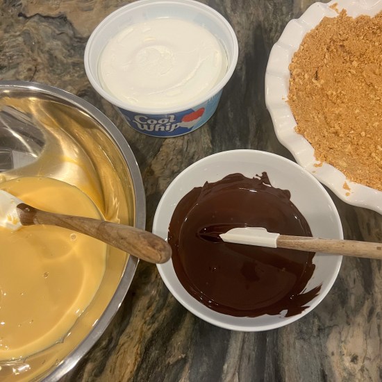 - To make the filling, melt chocolate in a large microwave safe bowl in 30 second increments, stirring between each, until melted and smooth. Cool for 5 minutes. Stir sweetened condensed milk into cooled chocolate and stir until smooth. Add 8-ounces whipped topping to the chocolate mixture and fold it carefully so as not to break the whipped topping.