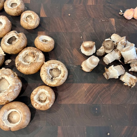 - Heat oil in a large skillet over medium heat. Add garlic and chopped mushroom stems; fry until any moisture has evaporated, taking care not to burn garlic. Set aside to cool.