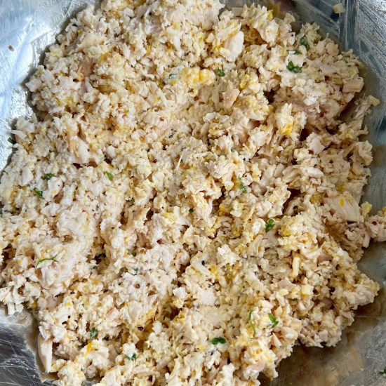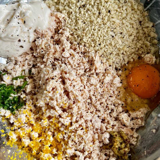 - Combine the chicken, panko, mayonnaise, egg, herb of choice, mustard, lemon zest and 1/2 teaspoon each salt and pepper in a bowl.