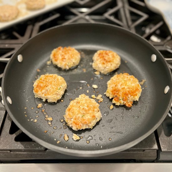 So for dinner last night, I decided I wanted to make a little patty to serve along with our sweet potatoes and broccoli. Rotisserie chicken has such a strong taste so it’s perfect for these kinds of recipes. I chopped it up using my blender, mixed in the rest of the ingredients and was able to have them cooking quickly after a short freeze (the freeze helps them stay together better while cooking). They are crispy and almost taste like you’re eating a crab or fish cake!