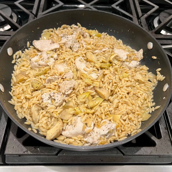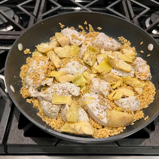 Tonight’s dinner has more of a mediterranean feel with the lemon, artichokes and olive oil. It comes together in about 30 minutes and you can even have some leftovers for the next night. Perfect!