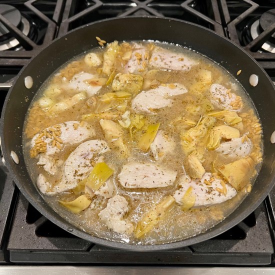 - Add the artichoke hearts, Italian seasoning, and water or stock to the pan and bring to a boil over high heat. Lower the heat to a simmer, return the chicken to the skillet, cover and cook 15 to 20 minutes.