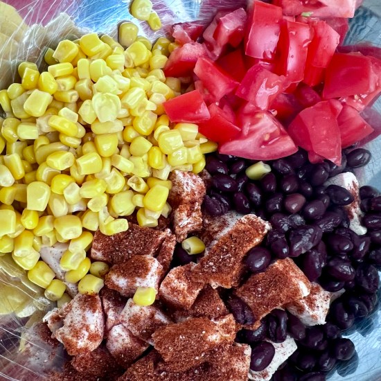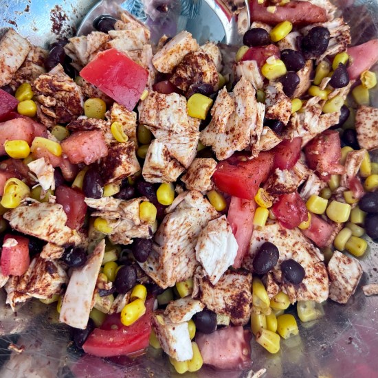 - In a large bowl, combine chopped or shredded rotisserie chicken, black beans, corn and chopped tomatoes. Mix in all of the seasonings (chili powder through black pepper) and stir to combine.