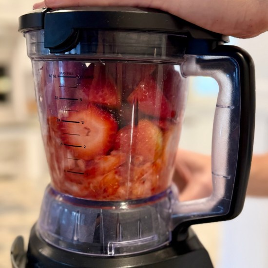 - In a blender, blend the strawberries and sweetener of your choice until the strawberries are pureed.