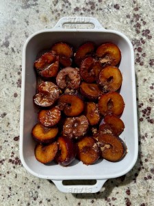 - Heat the oven to 350 degrees. Put the plums into the base of a shallow baking dish. Mix together the sugar, orange zest, cinnamon and flour and sprinkle over the plums. Sprinkle 2 tablespoons water and set aside.