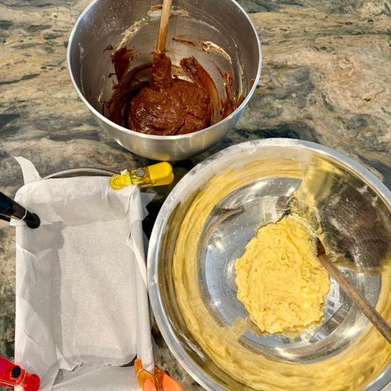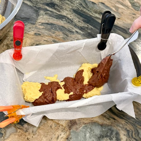 - In prepared baking tin, alternate spoonfuls of each batter and then swirl the batter with a knife.