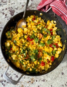 - Add chickpeas, tomatoes and spinach and stir for 1 minute before mixing in Korma sauce.