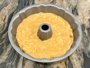 - Spray your Bundt pan with cooking spray, making sure to evenly coat the entire inner surface. Pour your batter into the pan.