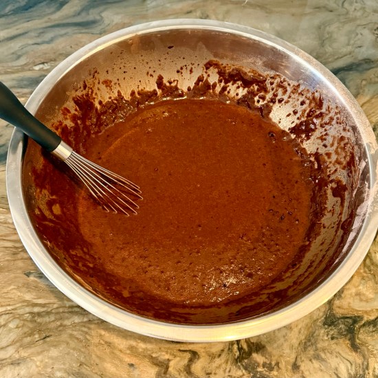 - Make the cake: Whisk the flour, cocoa powder, sugar, baking soda, baking powder, salt, and espresso powder (if using) together in a large bowl. Set aside. Using a handheld or stand mixer fitted with a whisk attachment (or you can use a whisk) mix the oil, eggs, and vanilla together on medium-high speed until combined. Add the buttermilk and mix until combined. Pour the wet ingredients into the dry ingredients, add the hot water/coffee, and whisk or beat on low speed until the batter is completely combined. Batter is thin.
