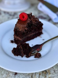 - Assemble and frost: If cooled cakes are domed on top, use a large serrated knife to slice a thin layer off the tops to create a flat surface. Discard or crumble over finished cake. Place 1 cake layer on your cake stand or serving plate. Evenly cover the top with frosting. Top with 2nd layer and spread remaining frosting all over the top and sides. I always use an icing spatula and bench scraper for the frosting. Garnish with chocolate chips and/or raspberries, if desired.