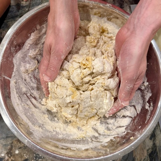 - Whisk oil into yeast, then beat in 4 eggs, one at a time, with remaining 1/2 cup sugar and salt. Gradually add flour. When dough holds together, it is ready for kneading. (You can also use a mixer with a dough hook for both mixing and kneading, but be careful if using a standard size KitchenAid–it’s a bit much for it, though it can be done.)