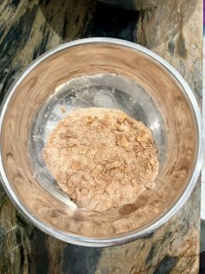 2. Make the crumble: mix 2/3 cup sugar, 1/3 cup flour and 1 tablespoon cinnamon in a small bowl with a whisk. Add 1/2 stick butter and mash with a spoon. Set the crumble aside.