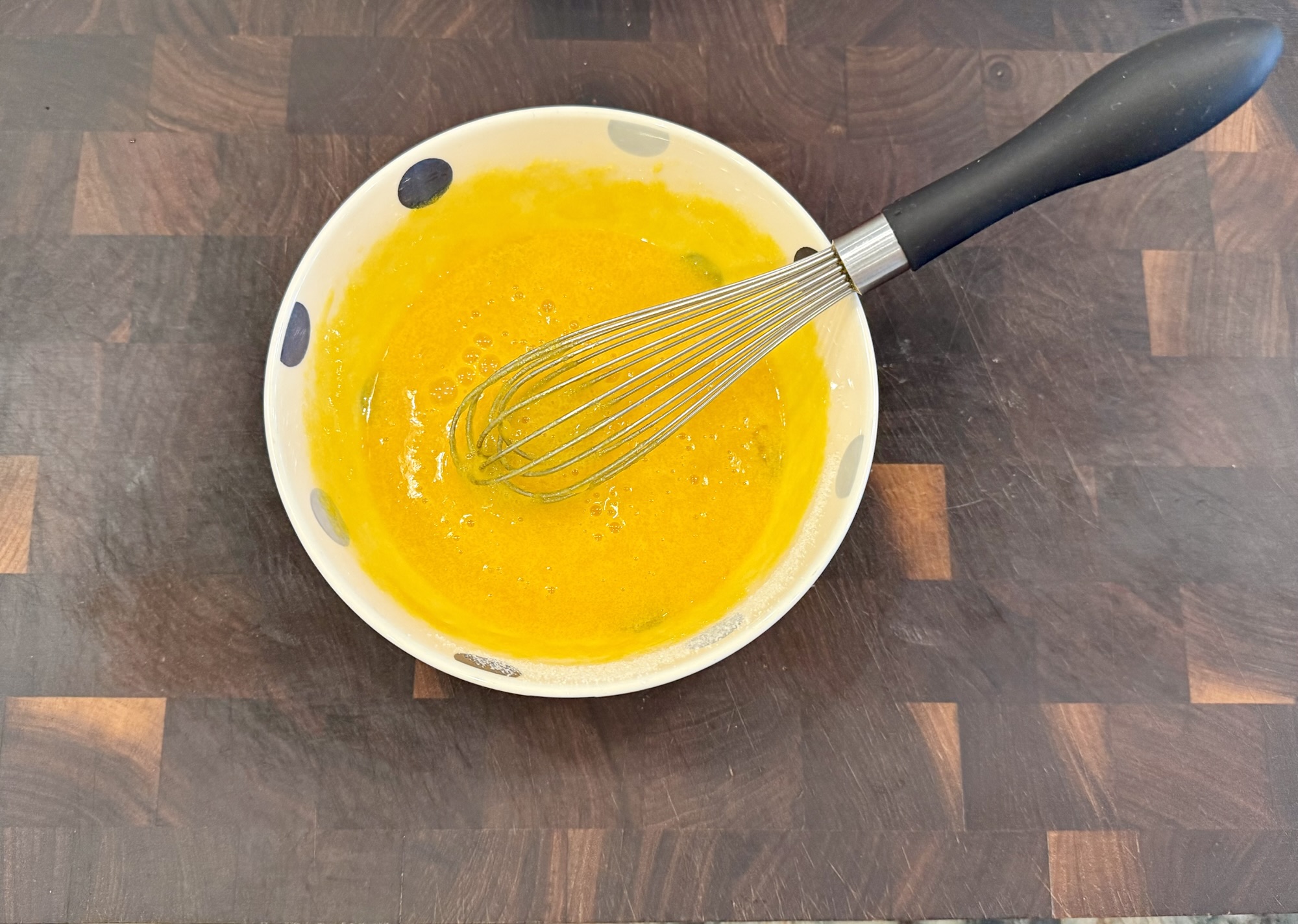 - Whisk the egg yolks and 1/2 cup of granulated sugar together. Set aside.