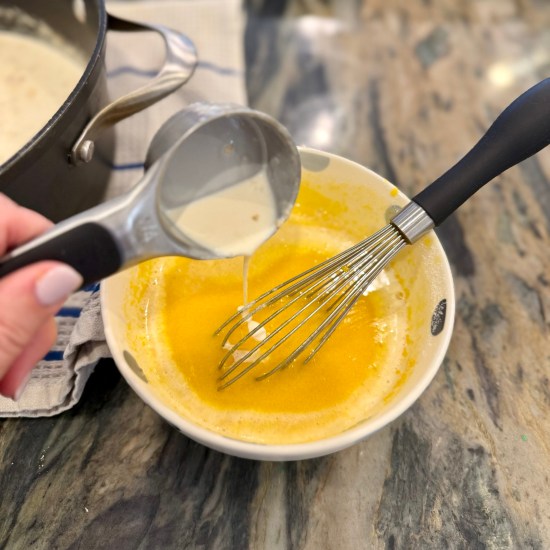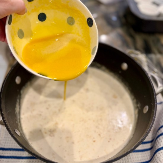 Remove about 1/2 cup of warm heavy cream and, in a slow and steady stream, whisk into the egg yolks. In a slow and steady stream, pour and whisk the egg yolk mixture into the warm heavy cream.
