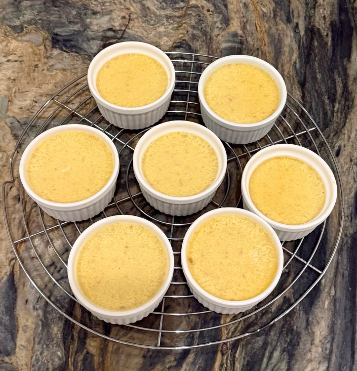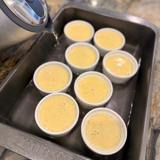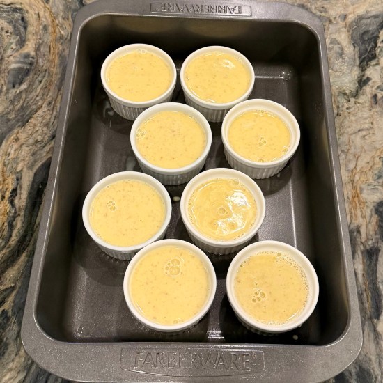 Place ramekins in a large baking pan. Divide custard between each ramekin, filling to the top. Carefully fill the pan with about a 1/2 inch of the hot water.