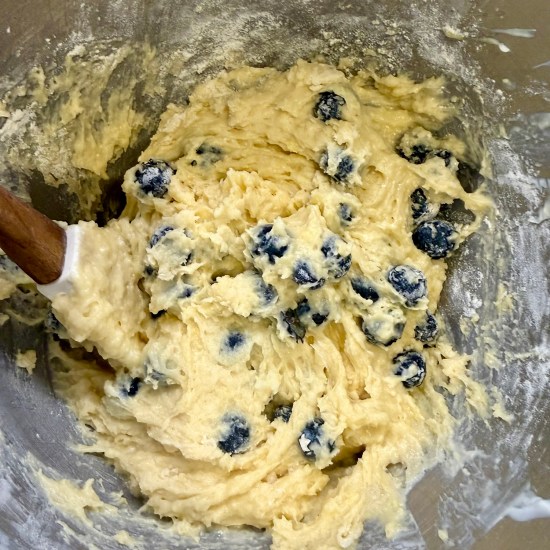 - With the mixer on low speed, add the dry ingredients, milk, and lemon juice into the wet ingredients and beat until no flour pockets remain. Gently fold in the blueberries. Avoid over-mixing. Batter is thick and fluffy.