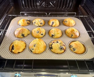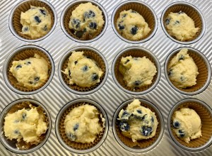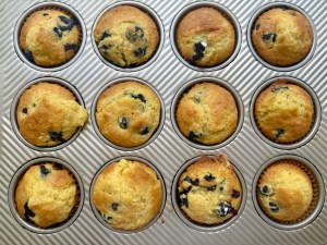 - 1 1/2 cups fresh or frozen blueberries, tossed in 1 tbsp flour (this stops them from falling to the bottom of the muffin)