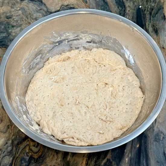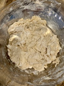 - Pour the flour into a large mixing bow and gently stir in the bloomed water (it will be a rough, sticky, shaggy dough).