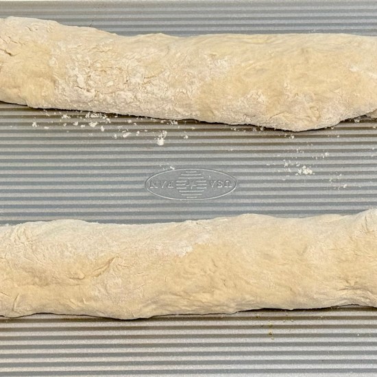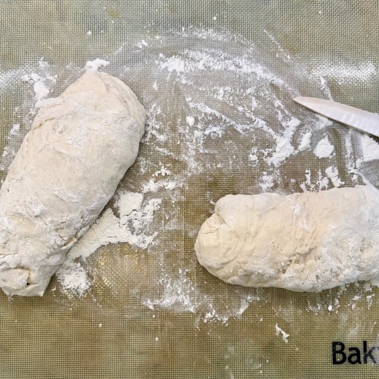 - Once the dough has risen, put some flour on a baking mat, and remove the dough from bowl. Divide the dough into two equal pieces and shape into a rectangle. Fold the sides in and under, and roll into a long baguette shape.